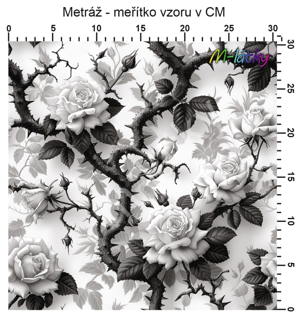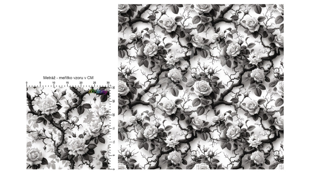 OB Metráž Black & white růže Ferra náš tisk na objednávku – výběr z materiálů