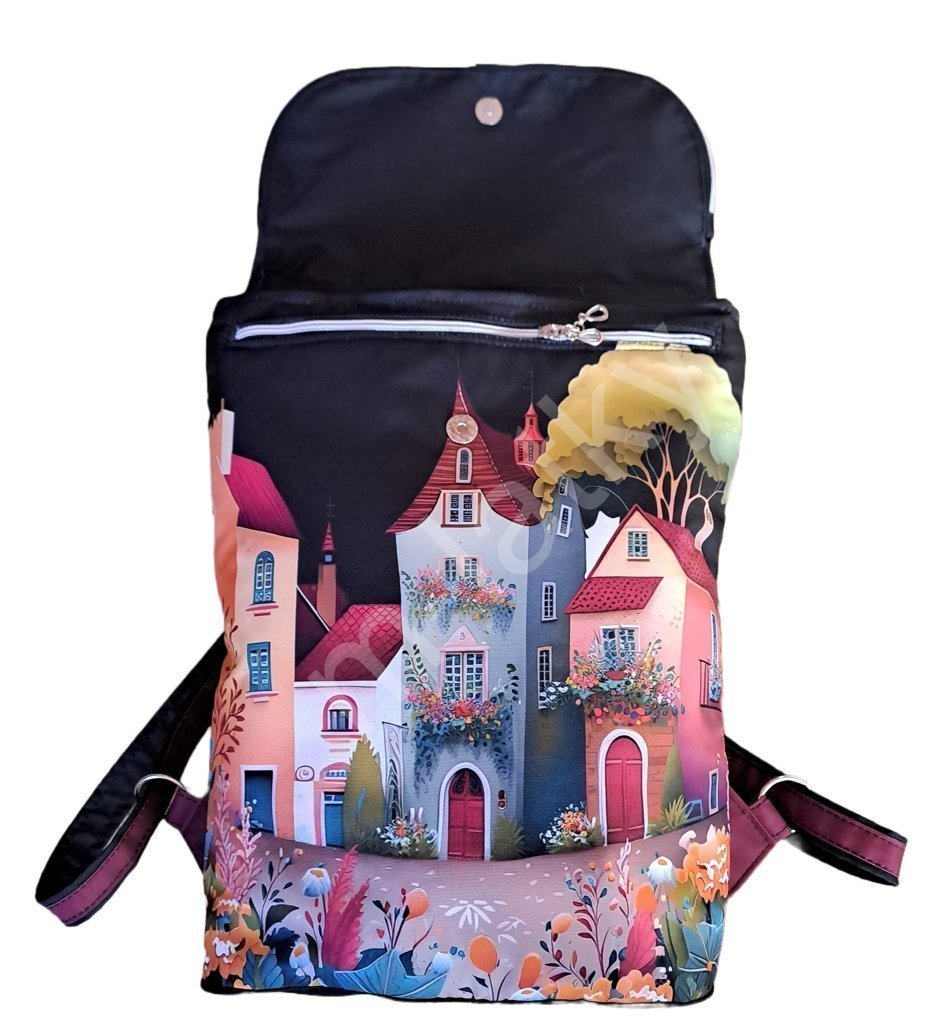 Překlápěcí klopa je zajištěna dvěma magnety(na ilustativním fotu je pouze jeden). Na přední straně batohu je pod klopu velká zipová kapsa.